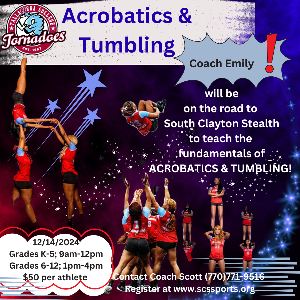 FOR IMMEDIATE RELEASE: SOUTH CLAYTON STEALTH announces the addition of Acrobatics and Tumbling Clinic SOUTH CLAYTON STEALTH will host its first ever Acrobatics & Tumbling Clinic that will be held under the guidance and leadership of Coach Emily of Talladega College. Coach Emily pioneered the program and made history at Talladega and is in third second year as the Head Coach of the Cheer, Dance and Acro Program. Coach Emily has 7 plus years of coaching competitive cheer and tumbling. South Clayton Stealth will aim to begin offering Acro &...